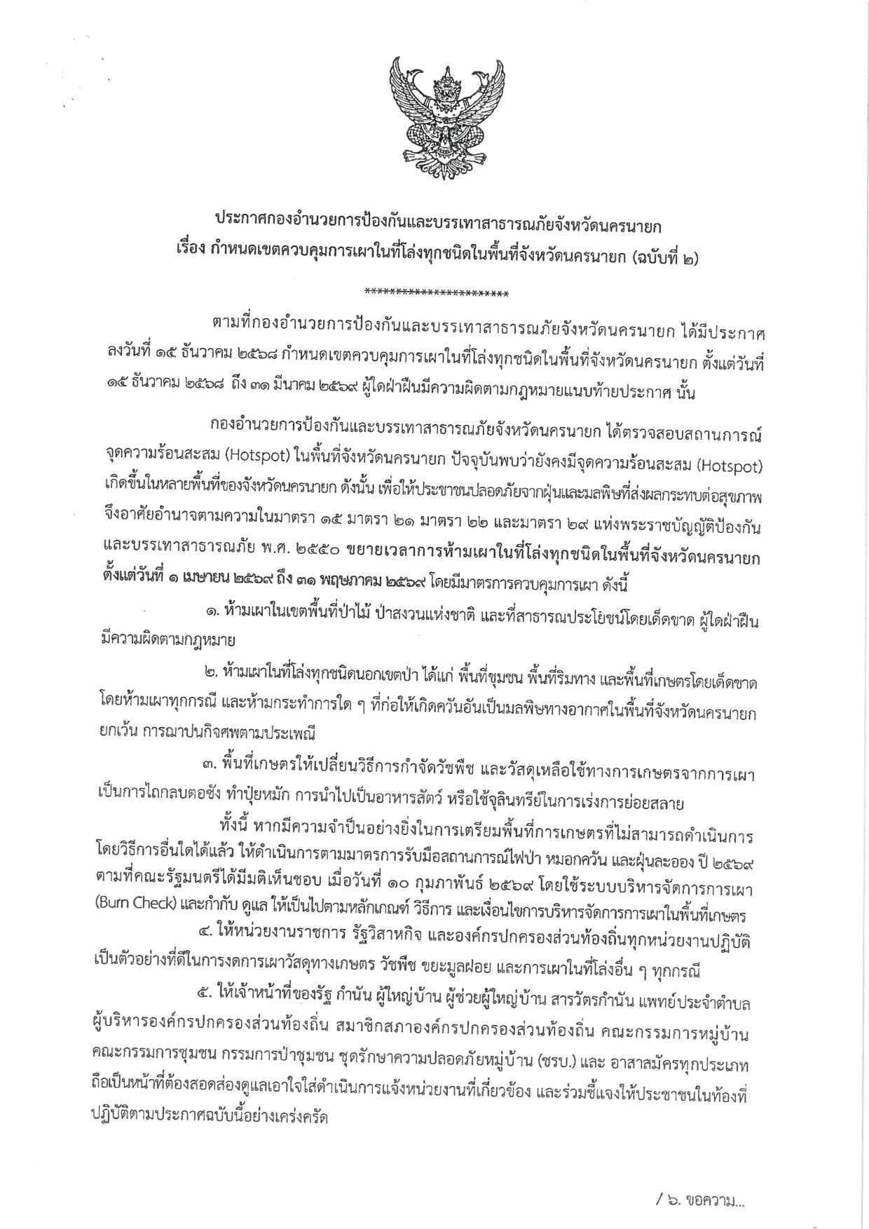 ประกาศกองอำนวยการป้องกันและบรรเทาสาธารณภัยจังหวัดนครนายก เรื่อง กำหนดเขตควบคุมการเผาในที่โล่งทุกชนิดในพื้นที่จังหวัดนครนายก (ฉบับที่ 2 )