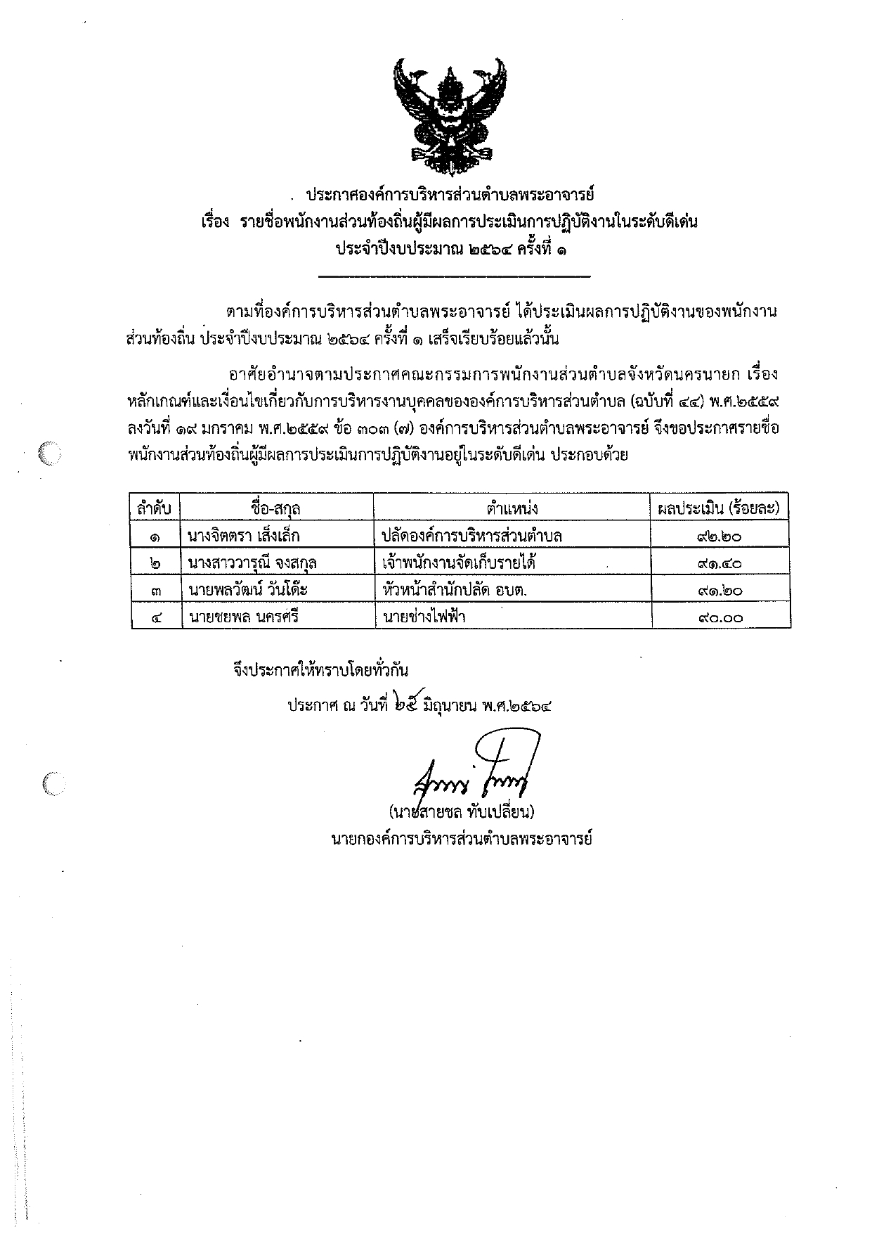 รายชื่อพนักงานส่วนท้องถิ่นผู้มีผลการประเมินการปฏิบัติงานในระดับดีเด่น ประจำปีงบประมาณ 2564 ครั้งที่ 1
